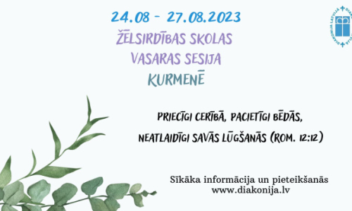 LELB Diakonijas centrs aicina draudžu kalpotājus un visus citus interesentus piedalīties ŽĒLSIRDĪBAS SKOLAS vasaras sesijā, kura notiks no 2023. gada 24. – 27. augustam Kurmenē. Sesijā turpināsim pavasara konferencē aizsākto tēmu par lūgšanu, dažādiem tās veidiem un tās praktizēšanu ikdienā.
