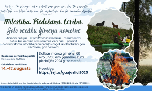 Vai vēlaties palīdzēt citiem? Mēs aicinām ikvienu draudzi un ikvienu, kura sirds atsaucas šim cēlajam nodomam, atbalstīt nepilno ģimeņu dalību šajā brīnišķīgajā nedēļas nogalē Gaujaslīčos! Ja vēlaties ziedot, lūdzu, veiciet ziedojumu Diakonijas centra kontā ar atzīmi: Ģimeņu nometnes atbalstam.